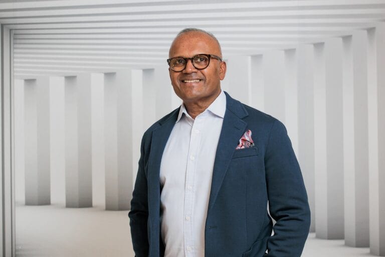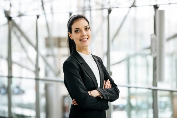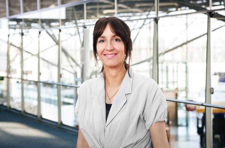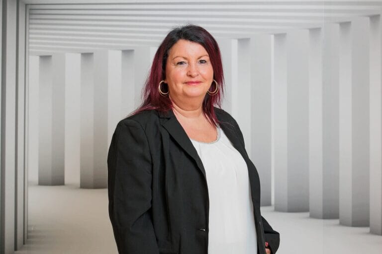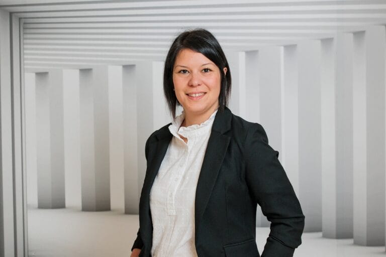 Darstellung von Sylvia Kosekova, die direkt in die Kamera blickt, in einem hellen Studio mit neutralem Hintergrund.
